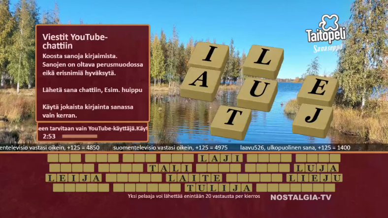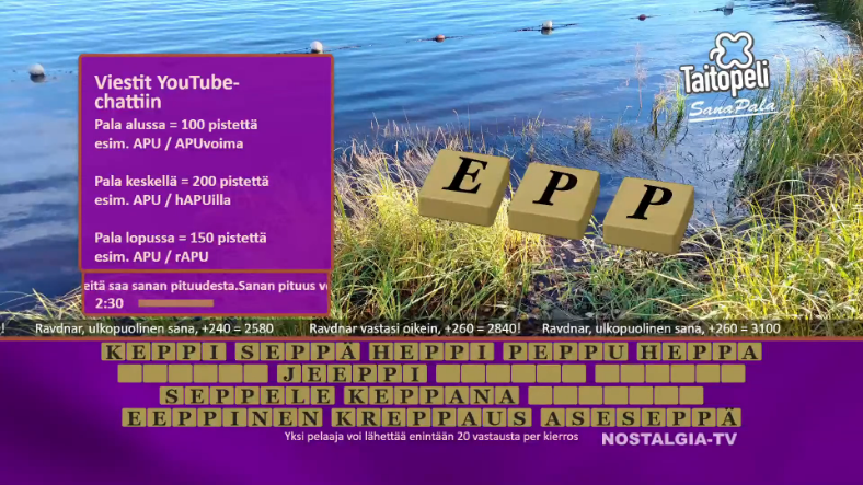 Sanasepässä muodostetaan ruudulla näkyvistä kirjainpalikoista sana, joka on perusmuodossa (esim. sato, ei sadossa). YouTube-chattiin kirjoitetaan vain yksi sana, muuta tähän viestiin ei tarvitse kirjoittaa.
